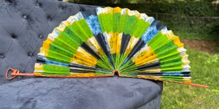 The Horizon Fan features an oversized design with unique abstract patterns on each side, blending yellow, white, sky blue, and navy blue hues that evoke the sun high above a serene shoreline. Crafted with a leather strap for easy carrying, this fan serves as both a striking wall display and an elegant mantle accent, adding a refined artistic touch to any space.